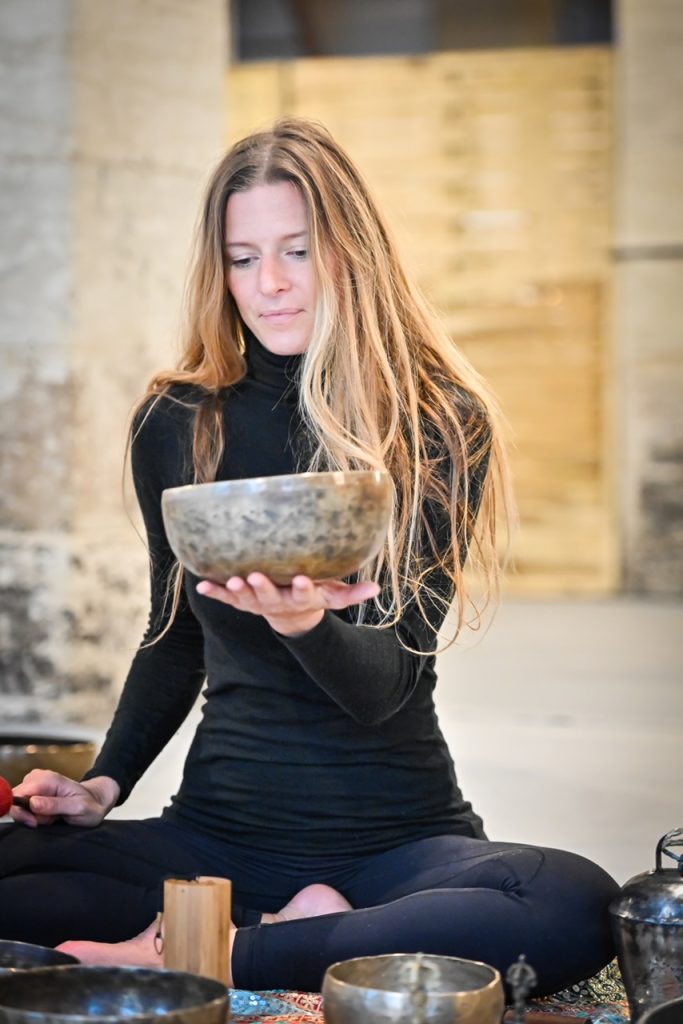 Marie Milla est sonothérapeute. Elle médite, chante et libère la créativité de chacun.